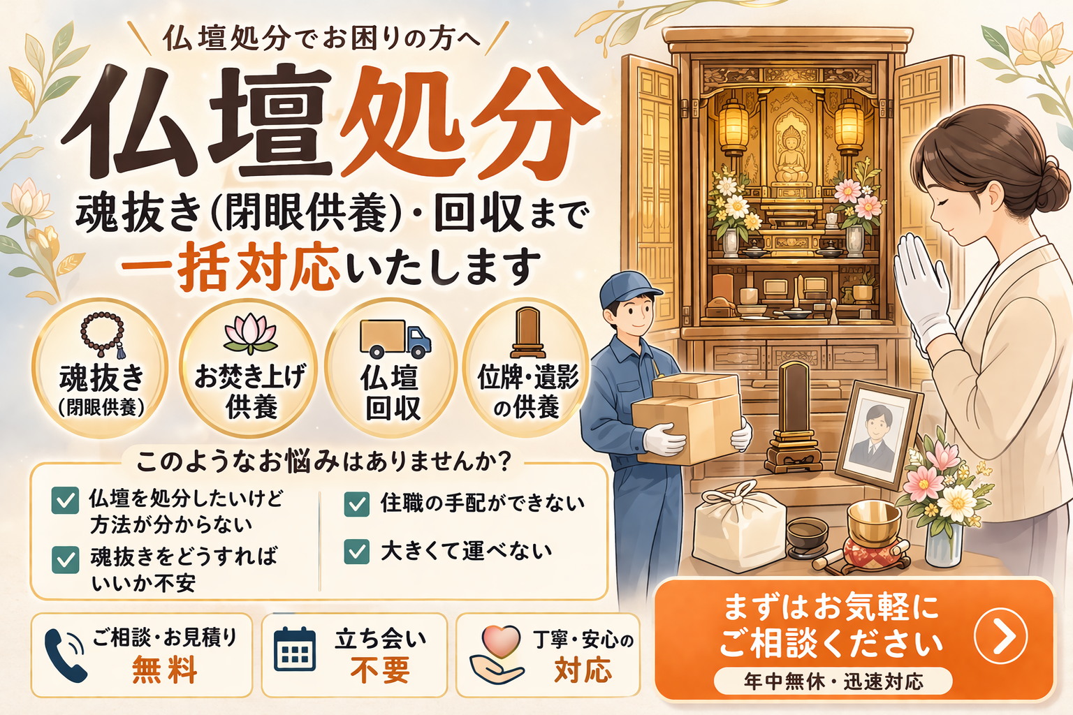 | 事業内容 | 仏壇処分・回収 仏壇の搬出作業 魂抜き(閉眼供養)手配 お焚き上げ供養 仏具・位牌の供養処分 遺品整理・実家片付け |